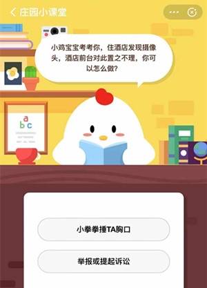 住酒店发现摄像头,酒店前台对此置之不理,你可以怎么做?支付宝庄园小课堂11月14日答题:对于支付宝蚂蚁庄园今天的答题已经更新了,参与其中答题即可获得180g饲料奖励。小鸡宝宝考考你,住酒店发现摄像头,酒店前台对此置之不理,你可以怎么做?下面一起来看看相关的信息介绍。2019-11-19